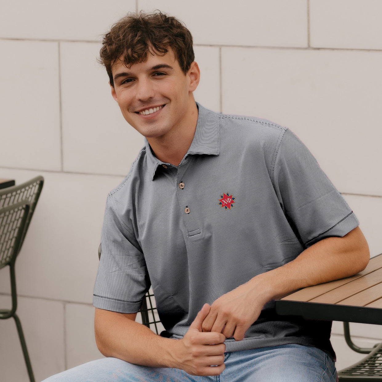 Chi Phi Peter Millar Jubilee Stripe Stretch Jersey Polo with Crest