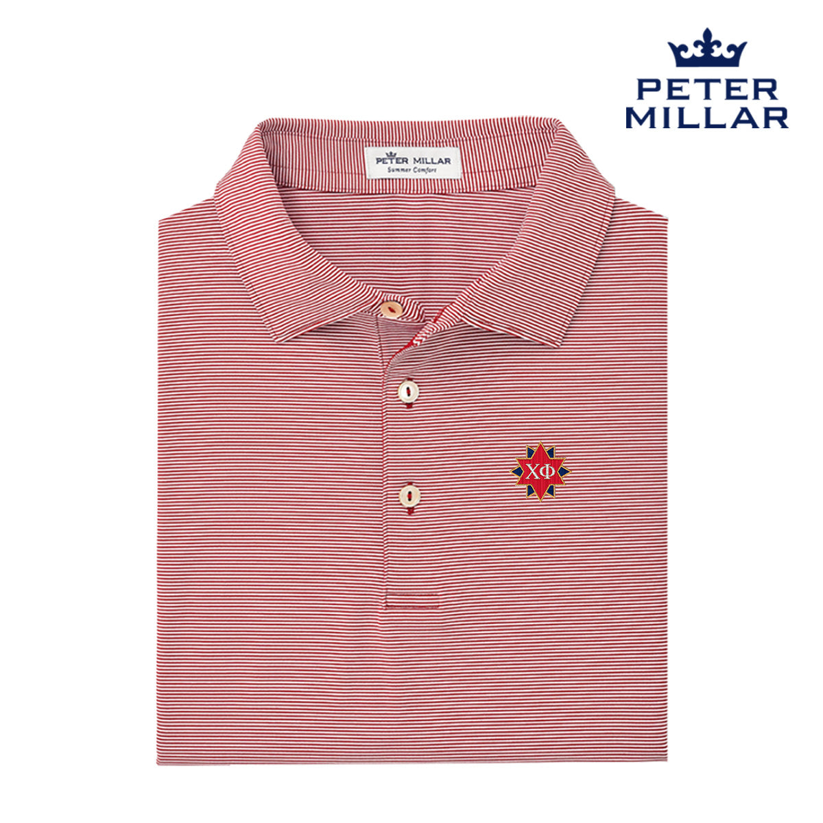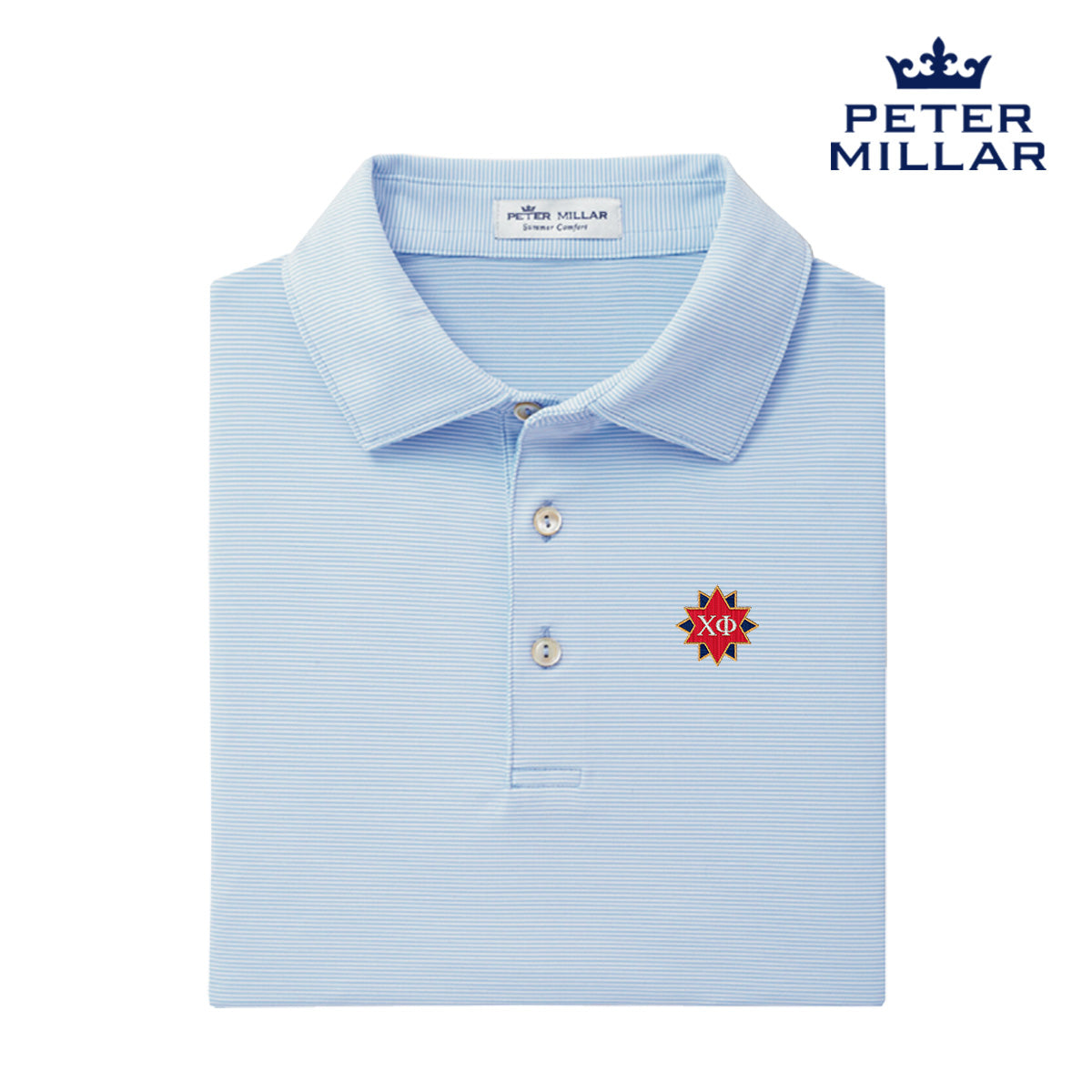 With its innovative UPF 50+ sun protection and lightweight, moisture-wicking fabric, our new Chi Phi Peter Millar jubilee polo is embroidered on the left chest with the Chi Phi crest to keep this item classic. The fabric stretches four ways for optimal mobility and is styled with a Sean self-fabric collar and a three-button placket makes this the perfect wardrobe addition. Please machine wash cold with like colors and tumble dry on low. Do not iron or dry clean.