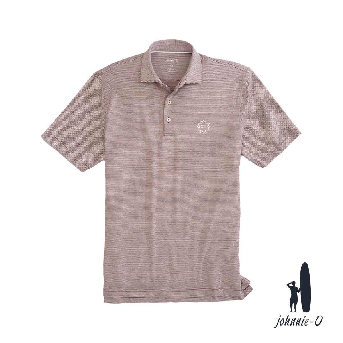Introducing the new Johnnie-O striped polo, available in maroon or blue. This stylish shirt features a classic striped design and showcases your Chi Phi pride with white embroidered letters on the left chest. Combining Johnnie-O's renowned quality with collegiate flair, this polo is perfect for campus events or casual wear. Available in two colors, this polo effortlessly blends comfort, style, and Chi Phi spirit.