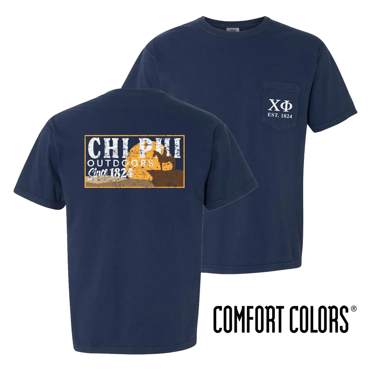 Embrace the spirit of adventure with the Chi Phi Great Outdoors Tee! This navy Comfort Colors short sleeve features a rugged, weathered back design of a cowboy on horseback overlooking rolling hills. The front pocket proudly displays Chi Phi's Greek letters and founding year for a classic touch. Made from soft-washed, garment-dyed fabric, this tee offers a relaxed fit perfect for everyday wear or outdoor adventures. Whether you're hitting the trails, traveling, or just repping your fraternity, this officially licensed shirt is a must-have for any brother.