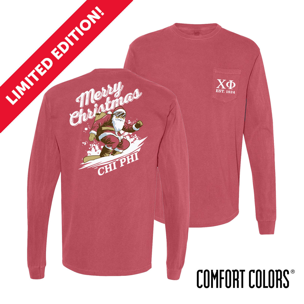 Embrace the holiday season with this festive long-sleeve tee! The New Holiday Shredding Santa Long-Sleeve Tee features a design that puts a fun, modern spin on traditional Christmas attire. The back showcases a lively graphic of Santa Claus snowboarding down a slope, with "Merry Christmas" arched above his head. Below, the Chi Phi name is cleverly integrated into the snowy landscape. On the front, Chi Phi Greek letters and established year are heat-sealed onto the pocket, allowing brothers to proudly display their organization's legacy.