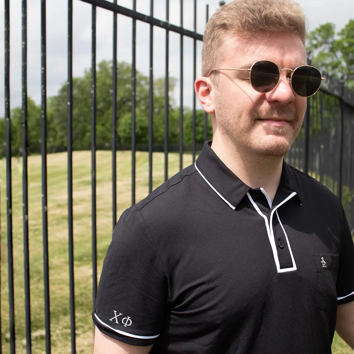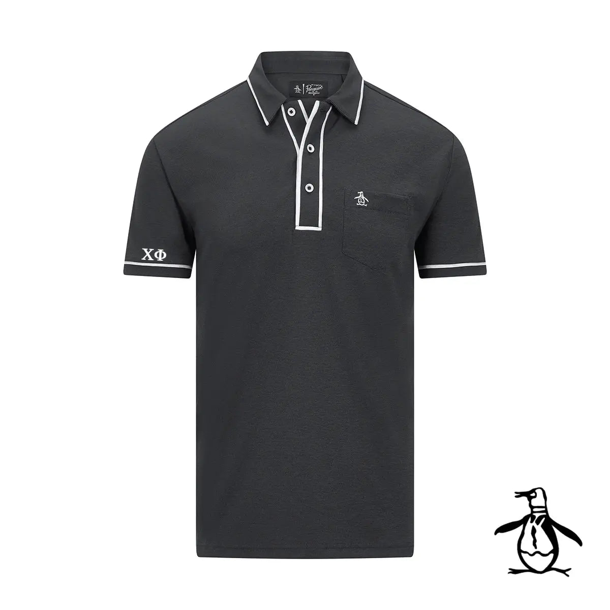 Introducing the new Chi Phi Original Penguin Greek Letter Polo - the perfect way for your brothers to showcase their fraternity pride on and off the golf course. This sharp black polo features white piping along the collar and placket for a crisp, stylish look. Crafted from a lightweight, breathable fabric, this polo is designed for both comfort and performance on the golf course or at fraternity events.